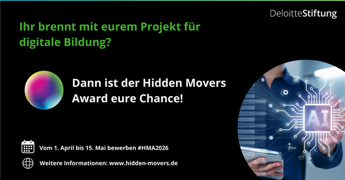 Die Deloitte-Stiftung zeichnet mit ihrem Hidden Movers Award 2026 erneut Projekte und Initiativen aus, die Bildung neu denken und gesellschaftliche Herausforderungen anpacken. In diesem Jahr stehen noch wenig bekannte, aber wirkungsstarke Bildungsinitiativen im Fokus, die junge Menschen in Deutschland insbesondere durch digitale Bildung stärken.