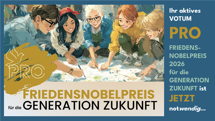 Dank der Idee von Bernhard Hanel haben wir jetzt alle und gemeinsam die Chance, Stimmgeberin und Geburtshelfer einer historischen Chance zu werden, ja, einer weltweiten Bewegung, die die „Generation Zukunft“ zum Weltthema Nr. 1 machen kann: die Initiative PRO FRIEDENSNOBELPREIS für die GENERATION ZUKUNFT.