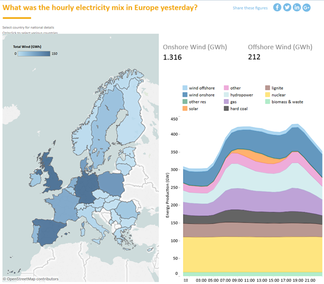 der europäische Windenergieverband WindEurope informiert täglich über den Energiemix in Europa. Dazu wertet er die Energiedaten des Vortags zu fünf Themengebieten aus: