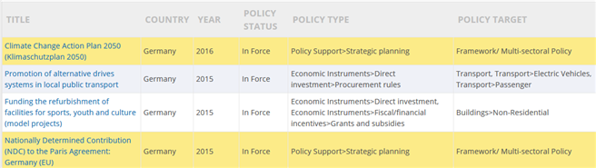 Seit 1999 bieten die IEA-Policies and Measures-Datenbanken Zugang zu Informationen über energiepolitische Strategien und Maßnahmen, um Treibhausgasemissionen zu reduzieren, die Energieeffizienz zu verbessern und die Entwicklung und den Einsatz erneuerbarer Energien zu unterstützen. Hier ein Auszug aus der Datenbank Climate Change für Deutschland: