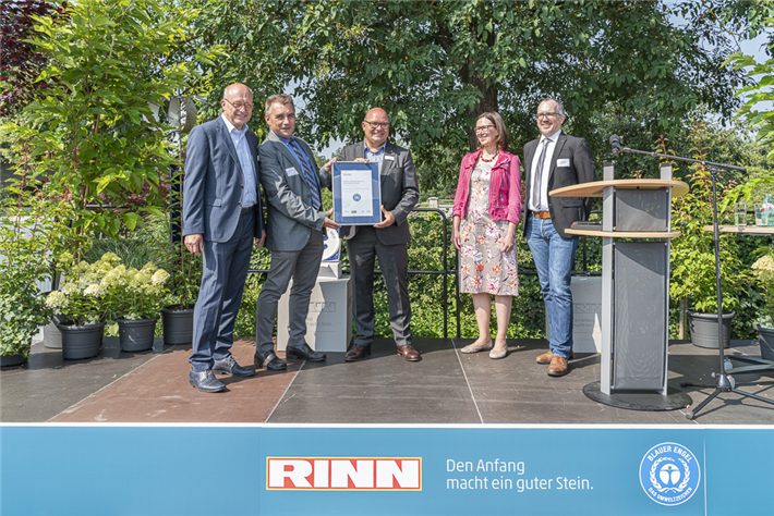 Als erster Betonsteinhersteller erhielt Rinn Beton- und Naturstein für seine klimaneutral produzierten Beton-Pflastersteine mit Recyclinggranulat das Umweltzeichen "Blauer Engel".
