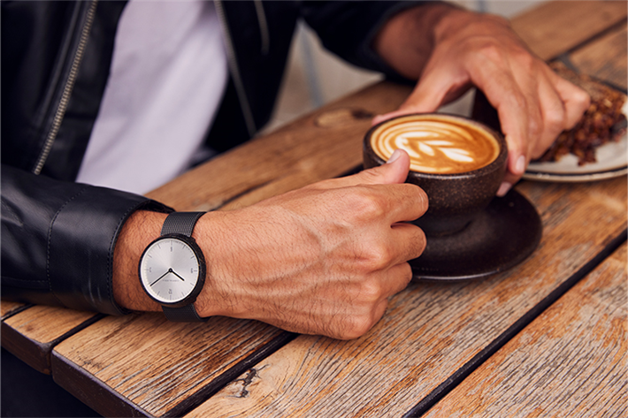 Der Kaffeesatz wird von Berliner Cafés und Röstereien mit Hilfe einer Fahrradflotte eingesammelt und durch das innovative Verfahren von Kaffeeform, in ein einzigartiges und robustes Material umgewandelt. Entstanden ist die Idee 2015, um aus etwas vermeintlich Nutzlosem etwas Neues und Beständiges zu schaffen. Das Kaffeeform Coffee- Material zeichnet sich durch einen feinen Kaffeeduft und einen besonderen, marmorierten Coffee-Look aus, der bei jedem Gehäuse anders ausfällt und so individuelle Unikate schafft. Die kleine Auszeit, die man sich am Tag gönnt, um Zeit für den Genuss zu finden –spiegelt sich im ganzen Design der Coffee Watch wider. Das abgerundete Gehäuse in Form, Farbe und Haptik erinnert einerseits an eine Kaffeebohne und andererseits an eine Tasse, und wurde mit einem raffinierten Designelement erweitert: Die Krone ist komplett in die Rückseite der Uhr eingelassen und rundet so den harmonisch runden Look stilvoll ab. Das Zifferblatt der Coffee Watch im Bauhaus-Stil wurde in zwei Ausführungen designt: einmal minimalistisch mit filigranen Gravuren für den subtilen Tiefgang sowie einmal klassischer und mit Ziffern in der Typographie Berliner Straßenschilder. Die Zifferblätter kommen jeweils in Schwarz glänzend oder Warm Silver mit Sunray Finish. Die Armbänder geben der Uhr dann das letzte spürbare Genusselement, denn hier gibt es die Auswahl zwischen veganem Leder auf Cellulose-Basis, pflanzlich gegerbtem Bio-Leder sowie mit zwei Mesh-Armbändern. Ausgestattet ist die Coffee Watch mit einem R756 Werk vom Schweizer Hersteller Ronda und hat einen Gehäusedurchmesser von 42,5mm.