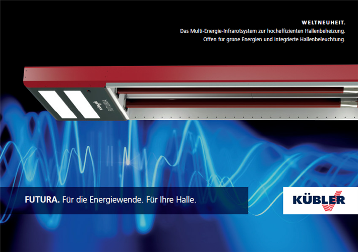 Die KÜBLER GmbH ist eine international agierende Unternehmensgruppe und gilt als Wegbereiter und Innovationsführer der modernen Infrarot-Heizungstechnologie. Das Kerngeschäft ist die Entwicklung und Fertigung hocheffizienter Premium-Technologien für die energiesparende und klimafreundliche Hallenbeheizung. KÜBLER bietet ein außergewöhnlich breites Produktspektrum für nahezu alle Hallentypen und Raumwelten.