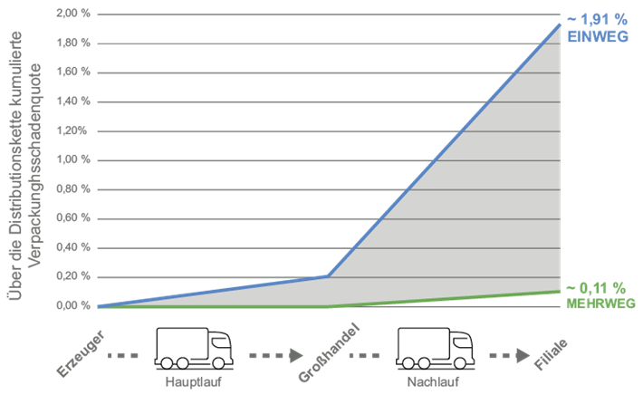 Die Ergebnisse der Aufnahmen zeigen, dass die Art der Verpackung (Einweg/ Mehrweg) einen signifikanten Einfluss auf die Schadensquote von Verpackungen hat. Mehrwegverpackungen verzeichnen gegenüber Einwegverpackungen einen deutlich niedrigeren Anteil an Verpackungsschäden. Hervorzuheben ist, dass bei Mehrwegverpackungen kein einziger Schaden aufgrund von mangelnder Verpackungsstabilität beobachtet worden ist. Vielmehr ist hier falsche Handhabung die Hauptursache für die minimalen Verpackungsschäden. Bei Einwegverpackungen hingegen sind neben äußeren Einflüssen vor allem die Verpackungsstabilität und die fehlende maßliche Abstimmung auf andere Verpackungen die häufigsten Schadensursachen.