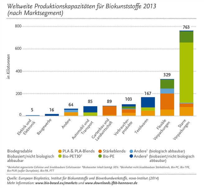 Der Verpackungssektor ist das derzeit mit Abstand stärkste Marktsegment für Biokunststoffe. Aber auch in den Bereichen Automobile, Unterhaltungselektronik und 3D-Druck weiten sich die Anwendungen für Biokunststoffe weiter aus. Zudem kommen Biokunststoffe immer häufiger in Sportausrüstung, Kleidung, Spielzeugwaren und der Bauindustrie zum Einsatz. Die Möglichkeiten sind fast unbegrenzt. Darüber hinaus wird die erst kürzlich verabschiedete EU-Richtlinie zur Reduzierung von Kunststofftüten die lokale Produktion von biobasierten und kompostierbaren Kunststoffen weiter stärken.