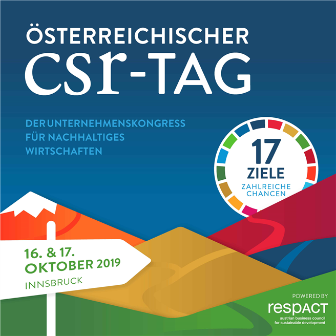 respACT- austrian business council for sustainable development lädt in Kooperation mit Wirtschaftskammer Tirol und Land Tirol zum 14. Österreichischen CSR-Tag am 16. und 17. Oktober 2019 in Innsbruck ein. Der renommierte Unternehmenskongress rund um verantwortungsvolles Wirtschaften in Österreich erkundet unter dem Motto „17 Ziele – zahlreiche Chancen" die Innovationskraft der UN-Nachhaltigkeitsziele (SDGs) für Unternehmen. Die Erschließung neuer Märkte, die Implementierung zirkulärer Produktionsmuster sowie die Kreation innovativer Geschäftsmodelle zur Bekämpfung sozialer und ökologischer Herausforderungen sind nur ausgewählte Beispiele, wie Unternehmen die UN-Nachhaltigkeitsagenda für Innovationen nutzen können.Beim Auftakt-Event am Abend des 16. Oktobers diskutieren Bischof Hermann Glettler (Diözese Innsbruck), Andrea Fischer (Glaziologin am Institut für Interdisziplinäre Gebirgsforschung der Österreichischen Akademie der Wissenschaften) und Simon Meinschad (respACT-Vorstandsmitglied und Geschäftsführer hollu Systemhygiene GmbH) unter der Moderation von Isabella Krassnitzer (ORF Landesstudio Tirol).