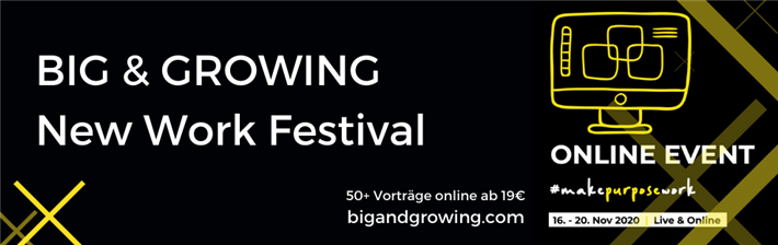 2019 gegründet, findet Big & Growing vom 16. bis 20. November in München, Berlin und Hamburg statt. Mit der Mission "Make Purpose Work” dreht sich alles rund um das Thema Purpose in der Arbeitswelt. Es wird über 50 Sessions mit Keynotes, Workshops, Diskussionen und Netzwerk-Veranstaltungen geben, wobei über 1000 Teilnehmer erwartet werden. Dabei geht es um neue Formen der Zusammenarbeit, (Selbst-) Führung, neue Kollaborationsarten und -Formen, innovative Arbeitsplätze und -Modelle sowie um das Thema Digitalisierung. Die unterschiedlichsten Gestalter der Arbeitswelt der Zukunft kommen dabei zu Wort. Mit dabei Vordenker, praktische Experten, Mentoren, Coaches, Führungskräfte, Trainer, Jobsuchende, sowie alle, die neugierig sind, die Arbeitswelt der Zukunft zu gestalten.
