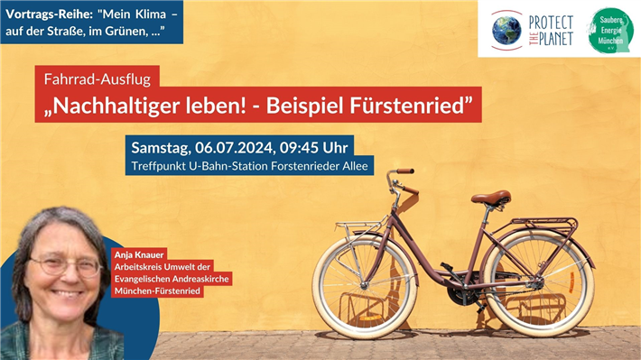 Im Rahmen unserer Serie „Mein Klima…" wollen wir diesmal einige dieser Nachhaltigkeitsorte mit dem Fahrrad „erfahren". Aber keine Sorge: Auf rd. 8 km Radl-Strecke wollen wir ganz geruhsam auf gut befahrbaren Fahrrad-Wegen und „grünen" Straßen Fürstenried und nähere Umgebung „beradeln" und an fünf Haltepunkten jeweils informiert werden, was zu sehen und zu erleben ist.