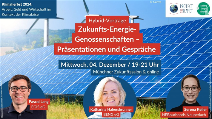 Bis 2030 sollen 80 Prozent des Stroms in Deutschland aus erneuerbaren Energien stammen. Einen erheblichen Beitrag für eine bürgernahe und partizipative Energiewende sollen Bürgerenergiegenossenschaften leisten. Es zeigt sich jedoch, dass insgesamt zu wenig Bürgerbeteiligung erreicht wird und nicht alle Bevölkerungsgruppen gleichermaßen partizipieren und auch profitieren. Wenn Bürgerenergie zu einer breiten Stütze der Energiewende werden soll, muss die Idee breiter bekannt und interessanter werden, auch im Geldbeutel. Deswegen kommen wir heute mit drei Bürger-Energiegenossenschaften ins persönliche Gespräch: Die bundesweit größte EGIS eg mit Sitz in Neuötting, die bekannte BENG eg in der Region München und die neugegründeten „Energiegemeinschaften eg" München-Perlach: Sie werden sich je in kurzen Präsentationen vorstellen und dann an Infotischen mit Ihnen ins Gespräch kommen – vielleicht wollen Sie ja Mitglied werden?