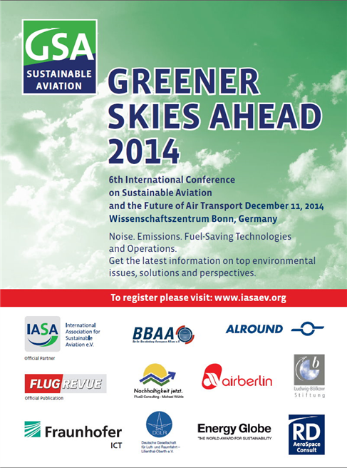 Weniger Fluglärm, geringerer Verbrauch, mehr Klimaschutz: Die kontinuierliche Verbesserung der Ökoeffizienz ist die größte Herausforderung der modernen Luftfahrt und damit auch die wichtigste Voraussetzung für weiteres Wachstum im Luftverkehr. Die unter Federführung der IASA (International Association for Sustainable Aviation e. V.) veranstaltete internationale Fachkonferenz GREENER SKIES AHEAD (Bonn, Wissenschaftszentrum,11. Dezember 2014) ist das führende Forum für nachhaltige Technologien und Entwicklungen in der Luftfahrt und zugleich eine ideale Gelegenheit zum Networking im Kollegenkreis.