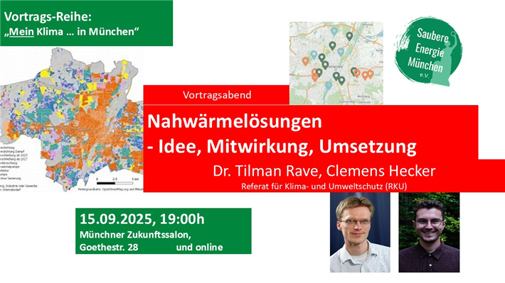 Um klimaneutrale Quartiere zu schaffen ist eine Umstellung der Wärmeversorgung dringend erforderlich. Nahwärmenetze stellen eine flexible Lösung dar, sie nutzen lokale Ressourcen wie Wärme aus Grundwasser, Biomasse, Solarthermie und_oder Abwärme aus Industrieanlagen. Um die Vorteile von Nahwärmekonzepten wird es in der Präsentation gehen, um Pilotprojekte, um die Einbindung der Bevölkerung und der Eigentümer:innen – dargestellt von den verantwortlichen Fachpersonen in der Münchner Stadtverwaltung.