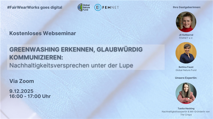 In unserem nächsten Webseminar der Reihe #FairWearWorks goes digital am 9. Dezember 2025 von 16:00 – 17:00 Uhr gehen wir der Frage nach, wo Greenwashing und Social Washing im Textilsektor beginnen – und wie Nachhaltigkeit glaubwürdig kommuniziert werden kann. Gemeinsam mit Tanita Hecking, Nachhaltigkeitsexpertin und Mit-Gründerin des Anti-Greenwashing-Newsletters The Crisps, möchten wir rechtliche und kommunikative Fallstricke rund um Nachhaltigkeitsaussagen im Bereich von Textilien diskutieren.