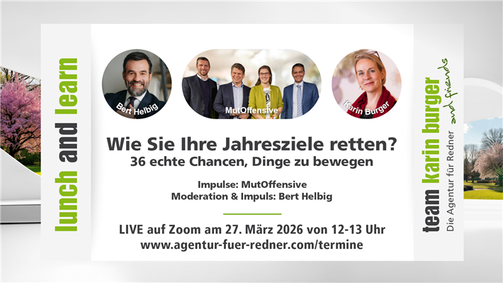 Was meistens fehlt, ist nicht Strategie. Nicht Kompetenz. Nicht Ressourcen. Was fehlt, ist Mut. Mut anzufangen. Mut dranzubleiben. Mut sichtbar zu werden. In unserem Lunch and Learn „36 Mut-Impulse" zeigen wir, wie Sie Ihre Jahresziele doch noch erreichen können – egal ob als Führungskraft, Unternehmen oder als Privatperson. Sie erhalten 36 konkrete, alltagstaugliche Impulse für die restlichen 36 Wochen des Jahres. Klar formuliert, direkt umsetzbar und bewusst verdichtet. Das wird ein Impuls-Feuerwerk!