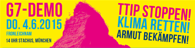 Anfang Juni treffen sich die Regierungschefs der führenden Industriestaaten zum G7-Gipfel im Schloss Elmau bei München. Mit einer großen und friedlichen Demonstration machen wir ihnen klar: Ihre Freihandelsabkommen TTIP, CETA und TISA treffen auf den breiten Widerstand der Menschen. Gemeinsam streiten wir dafür, dass endlich beim Klimaschutz ernst gemacht und Armut konsequent bekämpft wird.