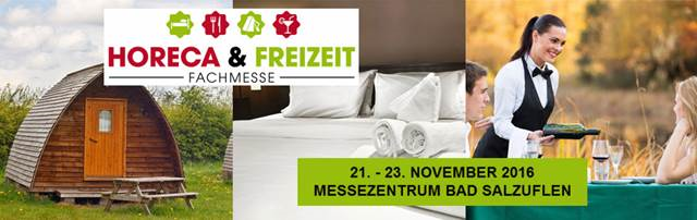 Die HORECA & FREIZEIT findet vom 21. bis 23. November 2016 zum zweiten Mal im Messezentrum Bad Salzuflen statt. Unter dem Motto „Gastfreundschaft erleben" präsentieren zahlreiche Aussteller ihr Produkt- und Leistungsspektrum.