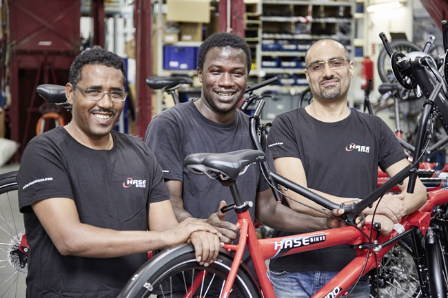 „Überdurchschnittlich motiviert und eine echte Bereicherung für unsere Werkstatt" – so beschreibt Marec Hase von HASE BIKES Flüchtlinge, die in seiner Manufaktur für Spezialfahrräder in Waltrop als Praktikanten und Mitarbeiter arbeiten. HASE BIKES ist Partnerbetrieb einer einjährigen Qualifizierungsmaßnahme von TÜV NORD College in Recklinghausen, in der aus vielen Ländern geflohene Menschen Sprach- und Fachunterricht in verschiedenen Handwerksberufen erhalten und mehrwöchige Praktika in handwerklichen Betrieben absolvieren.