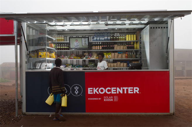 Berlin, 26. Oktober 2016 - Ein EKOCENTER ist wie ein Marktplatz. Am roten Kiosk können die Bewohner etwas einkaufen und in den Abendstunden im Licht der solarbetriebenen Lampen mit den Nachbarn plaudern. Sie können ihr Handy aufladen, im Internet surfen oder auf dem TV einen guten Film gucken. Das praktische rote Dach, das die Solarpanele trägt, schützt sie an Regentagen. Das Kiosksystem ist dabei modular erweiterbar – je nach konkretem Bedarf der Gemeinde. So gibt es an manchen EKOCENTER eine Trinkwasser-Aufbereitungsanlage, eine Ärztestation oder sogar eine Flutlichtanlage für den örtlichen Sportplatz.