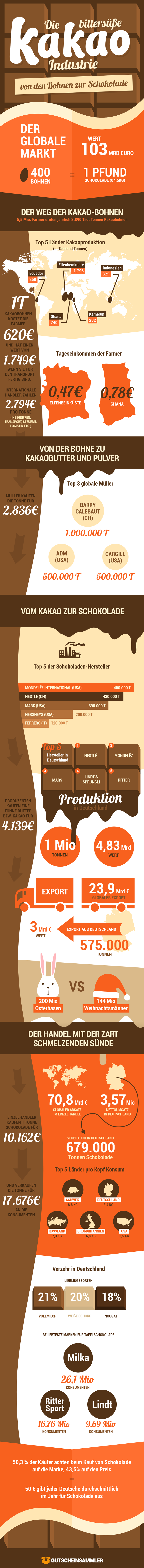 Die USA und die Schweiz führen auch die Top-Liste der größten Schokoladen-Hersteller an: Mondel?z International (USA) verarbeitet 450.000 Tonnen Butter bzw. Pulver zu Schokolade und verkauft diese unter anderem unter den Marken Milka und Mikado. Nestlé (Schweiz) steht auf Platz zwei mit 430.000 Tonnen verarbeiteten Rohstoffs und produziert unter anderem KitKat, Lion, Smarties, After Eight und viele andere Marken. Darauf folgen Mars (USA, 390.000 Tonnen), Hersheys (USA, 200.000 Tonnen) und Ferrero (Italien, 120.000 Tonnen). In Deutschland sind die umsatzstärksten Hersteller Ferrero, Mondel?z und Mars gefolgt von Lindt & Sprüngli und Ritter Schokolade (das einzige in Deutschland gegründete Unternehmen).
