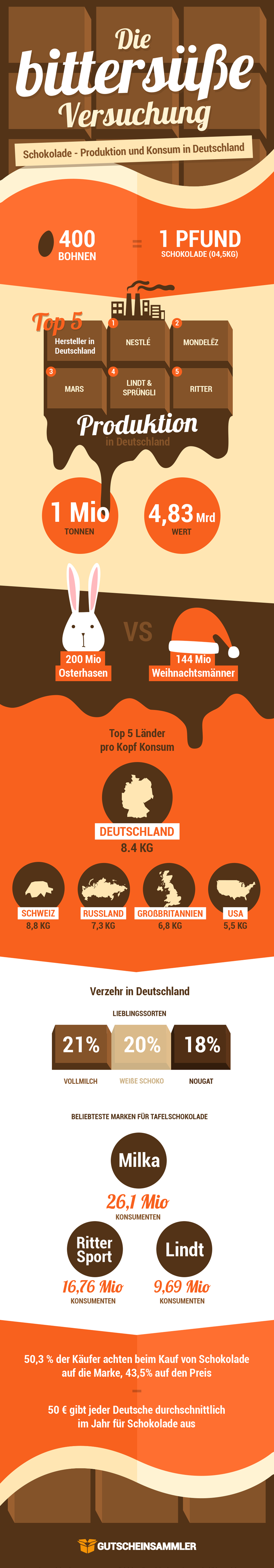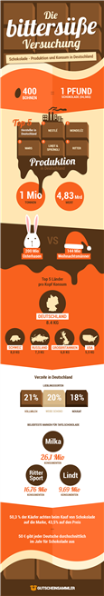 Bei der Wahl der Schokolade sind die Deutschen sehr markenbewusst: 50,3 Prozent der Käufer schaut auf die Marke, 43,5 Prozent auf den Preis. Das spiegelt sich auch bei den beliebtesten Marken wieder. Milka, Ritter Sport und Lindt sind laut einer Umfrage die Top-Marken in Deutschland. Je weniger Kakaobohnen in der Schokolade enthalten sind, desto beliebter sind sie hierzulande: Am liebsten essen die Deutschen die Sorte Vollmilch (21 Prozent), darauf folgen weiße Schokolade (20 Prozent) und Nougat (18 Prozent).