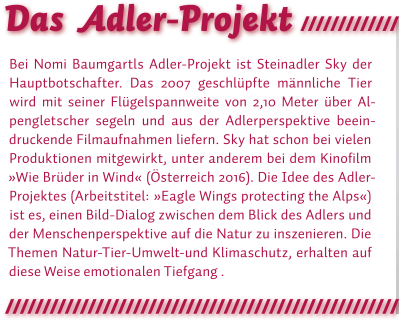 Nomi selbst sieht sich als »Bodenpersonal«, denn sie wird mit der Kamera die gleichen Bergregionen aus der Menschenperspektive erkunden. »Das Ganze ist ein Dialog«, erklärt sie die Idee, »bei dem die Adlerperspektive und der Menschenblick eine Konversation beginnen« – einen einzigartigen Dialog, der, wenn er denn gelingt, vor allem der Verdienst von Paul Klima sein wird, der sich wie kein zweiter in seine Adler hineinversetzen könne und daher genau wisse, wie die »Eagle-Cam« justiert und so eingesetzt werden kann, dass sie ihren Träger nicht beim Flug behindert.
