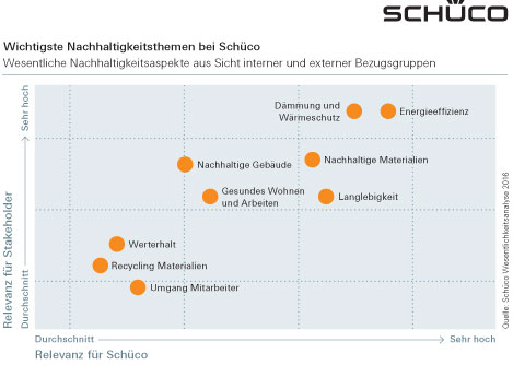 Als traditionsreiches Unternehmen mit Standorten in 43 Ländern und Arbeitgeber für 4.600 Menschen ist sich Schüco seiner besonderen Verantwortung bewusst. Das Unternehmen leistet an vielen Stellen seinen Beitrag, um auf aktuelle Herausforderungen wie etwa den demografischen Wandel, moderne Arbeitswelten, die Urbanisierung, den steigenden Energiebedarf und - damit verbunden - den fortschreitenden Klimawandel zu antworten. Basis dafür ist der Managementansatz "360° Nachhaltigkeit", der den gesamten Lebenszyklus eines Bauprojekts von der Planung, über die Umsetzung bis hin zum Recycling abdeckt. Der Nachhaltigkeitsbericht 2015/2016 ist das Ergebnis eines mehrmonatigen "Wesentlichkeitsprozesses", in dem verschiedene Projektgruppen die für Mitarbeiter und externe Stakeholder relevanten Themen ermittelt, ihnen konkrete Maßnahmen zugeordnet und mit Kennzahlen untermauert haben. Im Ergebnis wurden dabei fünf zentrale Handlungsfelder identifiziert: Produkte, Umwelt, Mitarbeiter, Gesellschaft und Lieferkette.