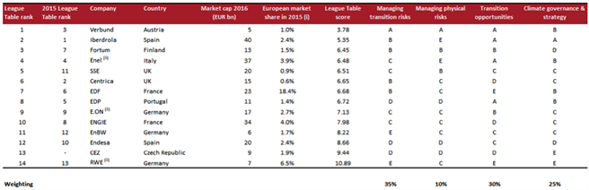 Die Energieversorgungsindustrie ist für ein Viertel der Emissionen weltweit verantwortlich und muss den Ausstoß von Treibhausgasen bis 2030 um zwei Drittel (67%) reduzieren, um die Ziele des Pariser Kima-Abkommens zu erreichen. Möglichkeiten für kurzfristige Änderungen sind aufgrund langfristiger Kapitalinvestitionen in fossile Kraftwerke begrenzt. Die Pläne Großbritanniens bis 2025 alle Kohlekraftwerke zu schließen sowie die Entscheidung von E.ON und RWE die Unternehmen nach fossilen Brennstoffen und erneuerbaren Energien aufzuspalten, machen deutlich, dass der Sektor im Umbruch ist. Versorgungsunternehmen, die größere Strommengen aus erneuerbaren Energien erzeugen, haben im Vergleich zu Wettbewerbern, die auf fossile Brennstoffe angewiesen sind, zehnfach geringere Emissionsvolumen.