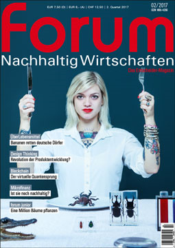 Das neue forum Nachhaltig Wirtschaften 2/2017 gibt Impulse für eine umweltschonende, genussreiche und achtsame Ernährung. Neben diesen zukunftsweisenden und innovativen Food-Konzepten werden revolutionäre Ansätze für die Unternehmensführung wie Design Thinking und die Blockchain vorgestellt.