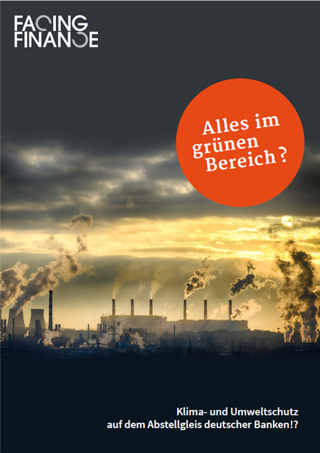 Vom 05. bis 13. Mai wird im Rahmen der Aktionswoche „Globale Divestment Mobilisierung" weltweit dazu aufgerufen, auf fossile Brennstoffe zu verzichten und die Investition in bzw. die Finanzierung von fossilen Unternehmen zu beenden. Vor diesem Hintergrund informiert eine neue Studie von Facing Finance VerbraucherInnen über die umwelt- und klimaschädlichen Praktiken deutscher Banken. „Alles im grünen Bereich? Klima- und Umweltschutz auf dem Abstellgleis deutscher Banken" analysiert anhand von Fallbeispielen, inwiefern die fünf größten deutschen Banken Geschäftsbeziehungen zu Unternehmen pflegen, die für ihre Umwelt- und Klimaschäden in der Kritik stehen.