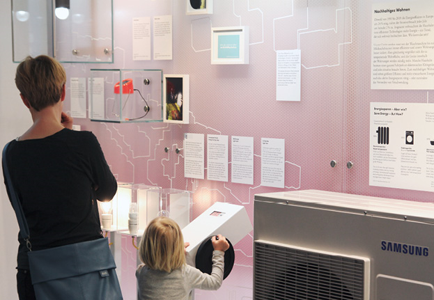 Mit jährlich rund 1,5 Millionen Besuchern ist das Deutsche Museum ein Dauerbrenner für Jung und Alt. Das Neue an der von den Kuratorinnen Sabine Gerber und Sarah Kellberg gestalteten Ausstellung energie.wenden ist die Interaktivität, mit der die Besucher zum Mitspieler der Ausstellung werden. An fast allen Stationen finden sich Elemente zum Anfassen, Ansehen, Anhören. Da gibt es sprechende Mülleimer, die über Recycling und den Cradle to Cradle-Ansatz informieren. Eine Modell-Stadt will vom Besucher per Dreh-Regler mit Energie versorgt werden – auf einem Bildschirm kann nachvollzogen werden, ob dabei Nutzungsengpässe entstehen. Deutsche Braunkohle oder kanadischer Ölsand erzählen dem Besucher, wie sie vor langer Zeit entstanden sind. Ein per Kurbel angetriebener Dynamo macht direkt erfahrbar, wie viel Energie nötig ist, um eine Energiesparlampe im Vergleich zu einer herkömmlichen Glühbirne zum Leuchten zu bringen. Diese interaktiven Elemente werden von den Besuchern gut angenommen – zu gut….. „Wir haben eine sehr aktive Ausstellung und sehr aktive Besucher. Dementsprechend geht schon mal was kaputt", erklärt dazu Kuratorin Sarah Kellberg.Besucher agieren als Politiker