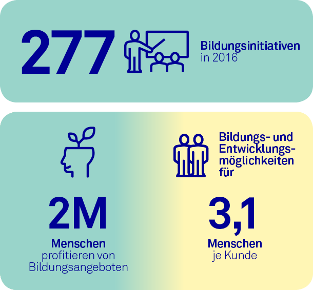Die 2016 mit Krediten der Triodos Bank finanzierten Bildungsinitiativen ermöglichten rund zwei Mio. Personen die Teilnahme an Bildungsangeboten. Im Durchschnitt ermöglichte jeder Kunde der Triodos Bank Bildungs- und Entwicklungsmöglichkeiten für mehr als drei Menschen.