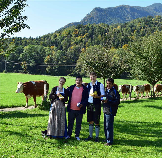 „Wenn ich wie heute meine Kollegen aus Ecuador treffe, dann zeigt mir das einmal mehr, wie wichtig es ist, immer wieder über den eigenen Tellerrand hinauszublicken", sagte Naturland Landwirt Jakob Sichler während des gemeinsamen Rundgangs über seinen Hof: „Denn mehr Öko-Landbau wird es nur geben, wenn Landwirtsfamilien weltweit von ihrer Arbeit leben können." Sichler bewirtschaftet einen 50 Hektar großen Milchviehbetrieb mit 40 Kühen, deren Milch er an die genossenschaftlich organisierte Molkerei Berchtesgadener Land liefert. Die Molkerei fährt auch entlegene und schwer erreichbare Bauernhöfe an und zahlt seit Jahren einen überdurchschnittlich hohen Milchpreis aus. Das sichert bäuerliche Existenzen und den Fortbestand der kleinstrukturierten Landwirtschaft der Region. Darüber hinaus verarbeitet die Naturland Fair zertifizierte Molkerei in ihren Milchprodukten auch die Erzeugnisse von internationalen Naturland Bauern wie etwa Zucker, Kakao – oder eben die Bananen der Naturland Bauern aus Ecuador.