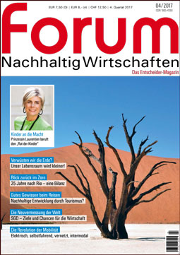Diese Beiträge und vieles mehr finden Sie in der aktuellen Ausgabe von forum Nachhaltig Wirtschaften. Das Heft mit dem Schwerpunkt „Globale Ziele für eine nachhaltige Entwicklung" ist ab 01. Dezember am Kiosk in Deutschland, Österreich und der Schweiz erhältlich und kann in der Printversion oder als PDF-Magazin direkt beim Verlag zum Preis von EUR 7,50 bestellt werden.