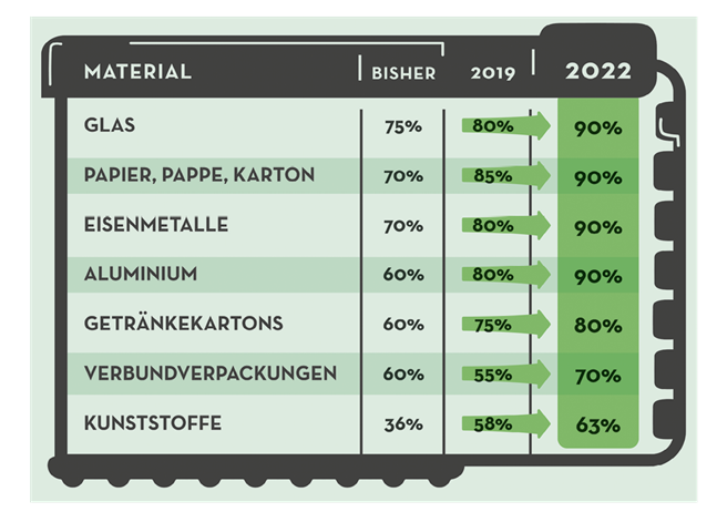Wichtige Hebel zur Erreichung der per Gesetz definierten Ziele sind die Vermeidung und anschließende Wiedergewinnung/-verwendung von Verpackungsabfällen. Die Bundesregierung wird hierzu Erhebungen durchführen und die Öffentlichkeit und Marktteilnehmer informieren. Als Ziele wurden Quoten definiert, die für einzelne Materialien ab 2019 erreicht werden müssen, weiter verschärfte Quoten gelten darüber hinaus ab 2022.