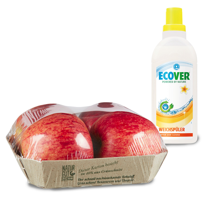 Der Handel hat großen Einfluss auf die Anstrengungen der Hersteller und Verpackungslieferanten und betreibt selbst vielfältige Aktivitäten, Verpackungen nachhaltiger zu gestalten. Die REWE-Gruppe strebt die Optimierung ihrer Eigenmarken an nach dem Motto „Vermeiden, Verringern, Verbessern". Man will hier quer über das gesamte Sortiment individuelle Lösungen vornehmen und so schnell Verbesserungen erreichen. Im Wasch-Putz-Reinigungsbereich werden beispielsweise heute schon Rezyklate eingesetzt, bei Obst- und Gemüse-Trays testweise Graspapier verwendet und in einigen Fällen schafft es der Handelsriese bereits, die Verpackungen ganz wegzulassen, z.B. durch die Technik „Natural Labelling". Ähnliche Anstrengungen nehmen alle großen Handelsketten vor.