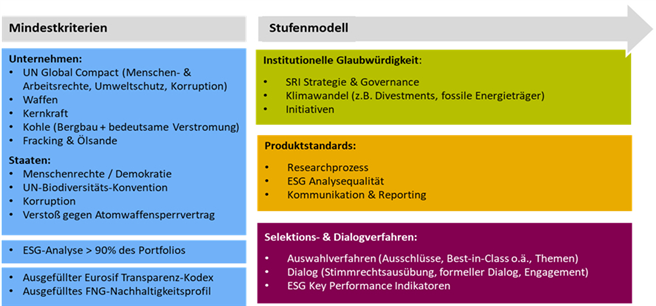 Die ganzheitliche Methodik des FNG-Siegels basiert auf einem Mindeststandard. Dazu zählen Transparenz-kriterien und die inhaltliche Berücksichtigung von Arbeits- & Menschenrechten, Umweltschutz und Korruptions-bekämpfung wie sie im Global Compact zusammengefasst sind. Auch müssen die einzelnen Unternehmen des jeweiligen Fonds explizit auf Nachhaltigkeits-Kriterien hin analysiert werden. Investitionen in Atomkraft, Kohlebergbau, bedeutsame Kohleverstromung, Fracking, Ölsande sowie Waffen und Rüstung sind tabu. Um sich vom Markt weiter abzuheben, zeichnet der Qualitätsstandard besonders hochwertige Nachhaltigkeits-Fonds mit bis zu drei Sternen aus, die sich in den Bereichen „institutionelle Glaubwürdigkeit", „Produktstandards" und „Selektions- & Dialogverfahren" besonders hervortun.