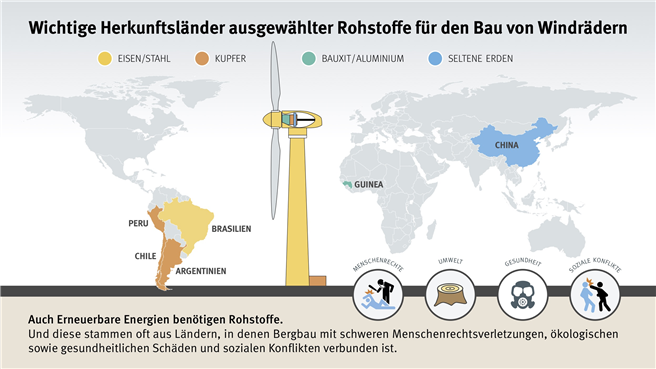„Unternehmen und Politik müssen verhindern, dass beim Abbau dieser Rohstoffe in Lateinamerika, Afrika und Asien die Menschenrechte verletzt und Umwelt zerstört wird", fordert Pirmin Spiegel, Hauptgeschäftsführer von MISEREOR. „Gleichzeitig sind wir dringend aufgefordert, unseren unverantwortlich hohen Verbrauch an Energie und Rostoffen zu senken.", so Spiegel.Während das Kohlekraftwerk Moorburg zum Beispiel täglich schätzungsweise 10.000 Tonnen problematische Import-Steinkohle verbrennt, werden Windkraft- und Photovoltaikanlagen durch Wind, Sonne und Wasser angetrieben. Für die Herstellung von Windkraft- und Photovoltaikanlagen werden jedoch hohe Mengen an Eisenerz aus Brasilien, Kupfer aus Peru und Chile, Silber aus Mexiko und Argentinien, Bauxit aus Guinea sowie seltene Erden aus China benötigt. Wie die neue MISEREOR-Studie zeigt, kommt es auch beim Abbau dieser Rohstoffe häufig zu schweren Menschenrechtsverletzungen und Umweltschäden: „Durch die Verschmutzung von Luft, Wasser und Böden werden Anwohner/-innen die Lebensgrundlagen entzogen. Bei Entscheidungen über Bergbauprojekte werden Mitbestimmungsrechte indigener und bäuerlicher Gemeinschaften verletzt. Umweltschützer/-innen und Menschenrechtsverteidiger/-innen werden oft kriminalisiert, verfolgt und manchmal ermordet", erklärt Pirmin Spiegel.