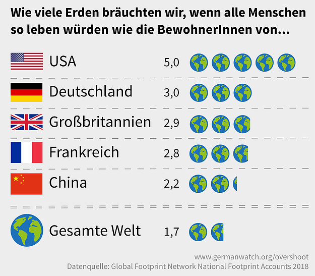 dDer deutsche Erdüberlastungstag verdeutlicht die ökologischen Grenzen des Planeten und zeigt, wie immens diese in Industrienationen wie Deutschland überschritten werden. Zum Vergleich: Bei einem weltweiten Ressourcenverbrauch wie heute in den USA bräuchten wir fünf Erden, bei einem wie in China 2,2, wie in Frankreich 2,8 und in Großbritannien 2,9 Erden. Die gesamte Weltbevölkerung bräuchte 1,7 Erden, um den globalen Bedarf an natürlichen Rohstoffen wie Ackerland und Wäldern nachhaltig zu decken. Der globale Erdüberlastungstag wird im August erwartet.