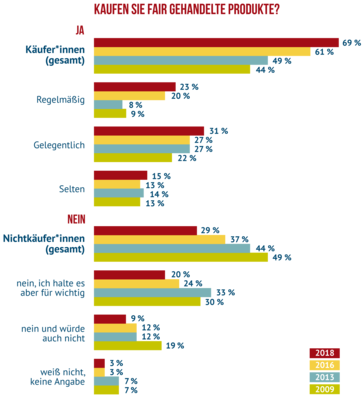 Wenn es um die Motivation für den Kauf fair gehandelter Produkte geht, steht der Verzicht auf Kinderarbeit, wie in den vergangenen Jahren, mit Abstand an der Spitze der wichtigsten Gründe. Jedoch hat die umweltschonende Produktion bzw. Bioqualität der Produkte aus Fairem Handel für die deutschen Konsument*innen über die Jahre an Bedeutung gewonnen. "Fair zu handeln bedeutet auch, nachhaltig zu handeln - für Mensch und Natur. Wir begrüßen diese gesellschaftliche Entwicklung", kommentiert Manuel Blendin.
