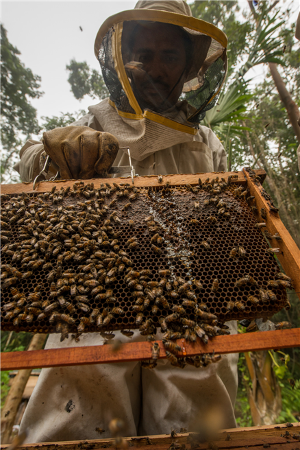 Um unabhängiger vom Kakao zu werden, haben Farmer mit Unterstützung der Rainforest Alliance zusätzliche Einkommensquellen erschlossen. So züchten sie beispielsweise Bienen für die Gewinnung von Honig und Grasnager, deren Fleisch in der Region als Delikatesse gilt. Positiver Nebeneffekt: Wildtiere werden von den Gemeinden nicht länger gejagt, schädliche Eingriffe in Ökosysteme werden so vermieden. Außerdem sind seither Behausungen für die Nutztiere gefragt, was auf lokaler Ebene für neue Arbeit sorgt. Als die Rainforest Alliance die Zusammenarbeit mit den Kakao anbauenden Gemeinden begann, mussten zunächst zentrale Strukturen geschaffen werden. Ein Gremium, das Land Management Board (LMB), wurde ins Leben gerufen, das sich aus Vertretern der Gemeinden zusammensetzt. Dieses neue Gremium koordiniert sämtliche Agrar- und Umweltschutzmaßnahmen und bietet den Farmern und Gemeinden vielfältige dauerhafte Unterstützung, z. B. im Bereich Klimabildung. Heute hat das LMB bereits alle Erwartungen aus der Startphase übertroffen und agiert völlig autark.