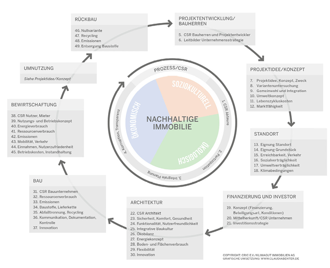 Derartige Fragen beschäftigen verstärkt auch Mitglieder von CRIC, einem im deutschsprachigen Raum tätigen Verein zur Förderung von Ethik und Nachhaltigkeit bei der Geldanlage. Schnell erklärte sich ein CRIC-Mitglied, die KlimaGut Immobilien AG, mit Gründer und Vorstand Fabian Tacke, dazu bereit, eine erste Skizze für einen Leitfaden zu entwerfen. Diese zielte nicht nur darauf ab, bestehende Instrumente zur Nachhaltigkeitsbewertung von Immobilien zu analysieren, sondern wollte auch Anforderungen an eine umfassend nachhaltige Ausrichtung von Immobilienprojekten formulieren.