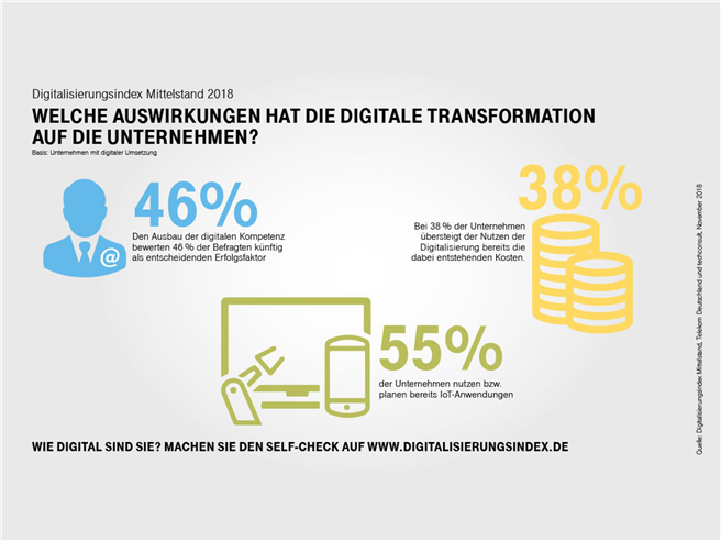 Digitalisierungsindex Mittelstand 2018 Wer digitalisiert, ist erfolgreicher Deutsche Unternehmen arbeiten kontinuierlich und mit steigenden Ansprüchen an ihrer digitalen Transformation. Ihnen genügt nicht mehr, nur über Digitalisierung bestehende Prozesse auf Effizienz zu trimmen oder Kosten zu senken. Weiterlesen... |