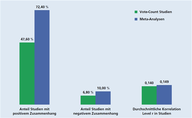 Circa 90 Prozent aller untersuchten Ergebnisse zeigen einen nicht-negativen Zusammenhang zwischen ESG-Aspekten und der finanziellen Performance auf. Wie links dargestellt, weist der überwältigende Anteil der Studien sogar einen positiven Zusammenhang auf: Bei Vote-Count-Studien (hier wird die Anzahl von Studien mit signifikant positiven, signifikant negativen und nicht-signifikanten Ergebnissen gezählt und die Kategorie mit dem größten Anteil wird als „Gewinner" votiert) sind es 47,6 Prozent bei Metaanalysen (d.h. ökonometrischen Review-Studien, die Effekt- und Stichprobeneffekte direkt importieren, um den Gesamteffekt über alle Primärstudien hinweg zu berechnen) sogar 72,4 Prozent.