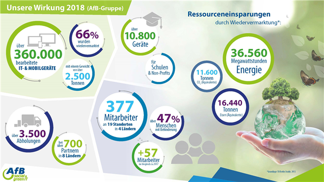 Die AfB kann die ökologische Wirkung ihres Arbeitsprozesses auf Grundlage einer Studie der Technischen Universität Berlin detailliert beziffern. Allein im vergangenen Jahr hat die AfB durch Remarketing und Recycling folgenden ökologischen Beitrag geleistet: Ressourcen-und Treibhausgaseinsparung AfB-Gruppe 2018 (im Vergleich zur Erst-/