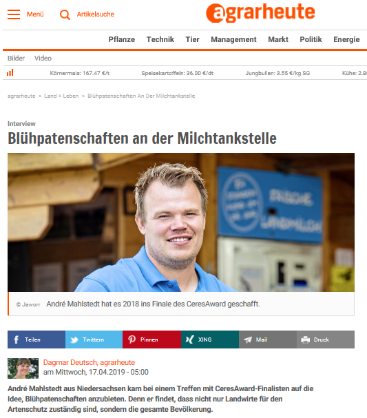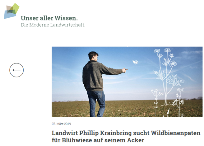 Um dann Angebote für Blühpatenschaften zu unterbreiten, die in dieser Art sehr fragwürdig sind, etwa in diesem Tenor: „Wir bieten Ihnen an, die Artenvielfalt der Bienen und Insekten mit Patenschaften für Blühflächen selbst in die Hand zu nehmen und einen Teil zur Ausweitung des „blühenden" Lebensraumes der Bienen und Insekten beizutragen. Hierdurch werden auch die Wildtiere, wie z.B. Feldhasen, Rehe, Fasane etc. in ihrem Lebensraum gestärkt. Selbstverständlich wird auf Pflanzenschutz und Düngung verzichtet." Die Patenschaft gilt immer über die Fläche verteilt und wird nicht genau auf eine Parzelle bezogen (was das bedeutet, ist nur dem Profi klar…).