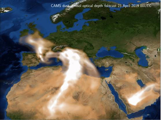 Staub aus der Wüste fliegt über Europa – mit zahlreichen Folgen. Durch Vorhersagen des Copernicus Atmosphere Monitoring Service (CAMS) können jedoch rechtzeitig Maßnahmen ergriffen werden. CAMS, implementiert vom Europäischen Zentrum für mittelfristige Wettervorhersage (EZMW) im Auftrag der Europäischen Union, hilft durch möglichst genaue, weltweite Vorhersagen zu Menge und Ort des Wüstenstaubs in der Atmosphäre Wissenschaftlern, Umweltorganisationen, dem Energie- und Transportsektor, Unternehmen und Individuen.