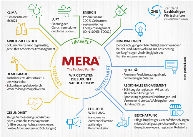 Im März ließ sich die MERA Tiernahrung GmbH als erstes Unternehmen der Tiernahrungsbranche durch den TÜV Rheinland Cert nach dem ZNU-Standard Nachhaltiger Wirtschaften des Zentrums für Nachhaltige Unternehmensführung der Fakultät für Wirschaftswissenschaften der Universität Witten/Herdecke (ZNU) zertifizieren. Damit legt der Hersteller von Premium-Hunde-und Katzennahrung den Grundstein für eine nachhaltigere Unternehmensführung. Um die ZNU-Zertifizierung Nachhaltiger Wirtschaften zu erhalten, müssen Unternehmen ein systematisches Nachhaltigkeitsmanagement aufbauen. Dies beinhaltet neben der strategisch nachhaltigeren Ausrichtung des Unternehmens auch die Umsetzung und Dokumentation einer Vielzahl von Maßnahmen auf ökologischer, ökonomischer und sozialer Ebene.