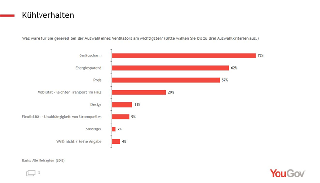 Ergebnis: Für die Auswahl eines Ventilators mit am wichtigsten ist, dass er geräuscharm ist (76 Prozent der Befragten). Für 62 Prozent ist ein sparsamer Energieverbrauch mit ausschlaggebend, der Preis ist für 57 Prozent ein wichtiges Argument, und für 29 Prozent spielt der einfache und leichte Transport im Haus eine wesentliche Rolle.