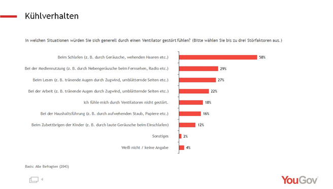 Gefragt nach Situationen, in denen ein Ventilator als störend empfunden wird, antworten 58 Prozent "beim Schlafen, zum Beispiel durch Geräusche und Wind", gefolgt von 29 Prozent, die angeben, sich am meisten bei der Mediennutzung, also beim Fernsehen und Radiohören, gestört zu fühlen, zum Beispiel durch Nebengeräusche des Ventilators. Eine geringe Lärmbelastung ist demnach mit großer Übereinstimmung die Hauptanforderung an einen Ventilator, die vielleicht von einem Großteil der marktüblichen Ventilatoren nicht erfüllt wird.