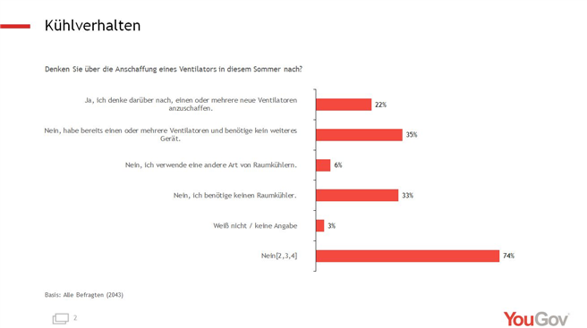 Befragt nach den Kaufabsichten geben 22 Prozent der Befragten an, an die Anschaffung eines oder mehrerer Ventilatoren in diesem Sommer zu denken, während 35 Prozent bereits über einen oder mehrere der Kühlgeräte im Haushalt verfügen. Nur 6 Prozent der Befragten setzen eine andere Art von Raumkühlern ein. 33 Prozent verzichten ganz auf Raumkühler.
