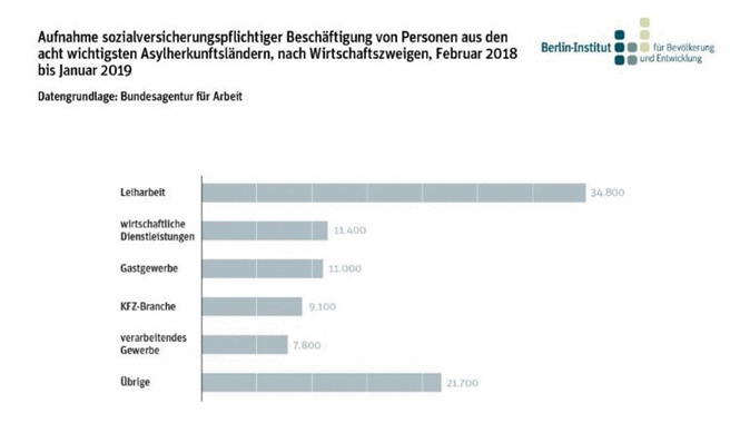 Ende des Jahres 2018 lebten knapp 1,7 Millionen Schutzsuchende in Deutschland. Die meisten von ihnen sind seit 2015 gekommen. Flucht ist keine Erwerbszuwanderung und Geflüchtete kommen nicht zuvorderst als Arbeitskräfte ins Land. Doch für eine erfolgreiche Integration sollte der Übergang von Geflüchteten in Ausbildung, in Nachqualifizierung oder direkt in Beschäftigung so schnell wie möglich erfolgen.Die Arbeitsmarktintegration von Geflüchteten erfordert erfahrungsgemäß einen langen Atem, gelingt derzeit aber besser als anfangs erwartet. Im Februar 2019 hatte fast jede dritte Person aus den acht wichtigsten Asylherkunftsländern eine sozialversicherungspflichtige Arbeit gefunden. „Das ist unzweifelhaft ein Erfolg, der aber mit Vorsicht zu genießen ist", so Reiner Klingholz, Direktor des Berlin-Instituts für Bevölkerung und Entwicklung, „denn viele der Geflüchteten arbeiten in Branchen, in denen die Fluktuation hoch ist, der größte Teil von ihnen ist in der Leiharbeit und in Helfertätigkeiten untergekommen."